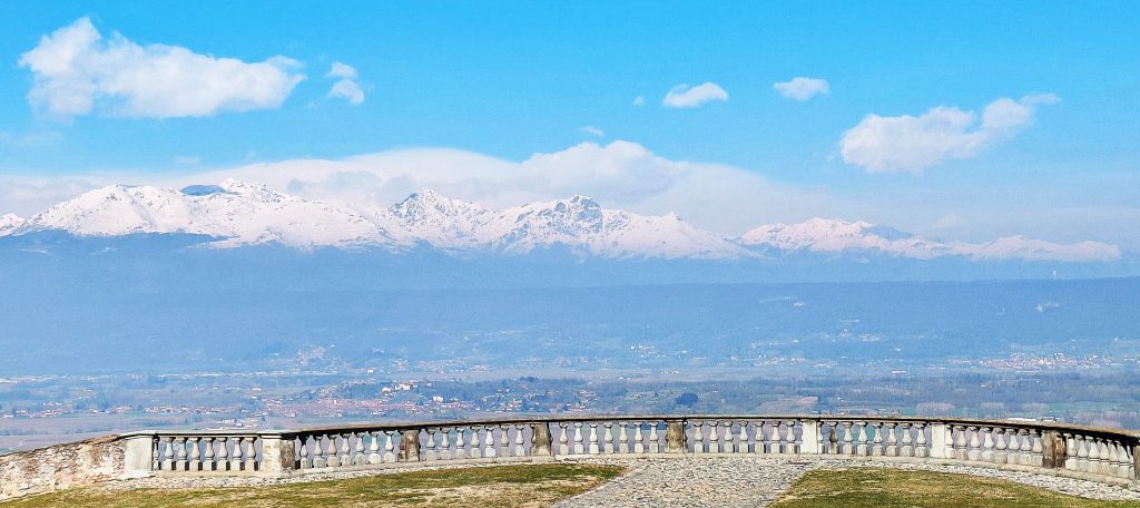 Dalla terrazza del Casello si può ammirare l’anfiteatro morenico di Ivrea (AMI), un impressionante rilievo morenico di origine glaciale situato nel Canavese (nella foto, la striscia scura ai piedi dell’arco alpino). L’AMI risale al periodo Quaternario e fu creato dal trasporto di sedimenti verso la Pianura Padana operato nel corso delle glaciazioni dal grande ghiacciaio che percorreva la vallata della Dora Baltea. Con una superficie di più di 500 km² è una tra le unità geomorfologiche di questo tipo meglio conservate al mondo. Come estensione è superato in Italia solo dall’analoga formazione che circonda il lago di Garda.