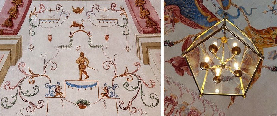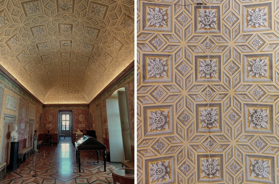 Decorazioni simmetriche dei soffitti (salotto rosso) e lampadari a base pentagonale.