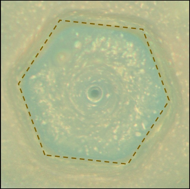 Lesagono di Saturno è una particolare conformazione nuvolosa di forma esagonale persistente al polo nord di Saturno, a circa 78°N. Origine della simmetria.